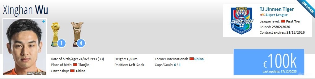 北京时间2月25日,德转更新,山东泰山后卫吴兴涵租借加盟天津津门虎。