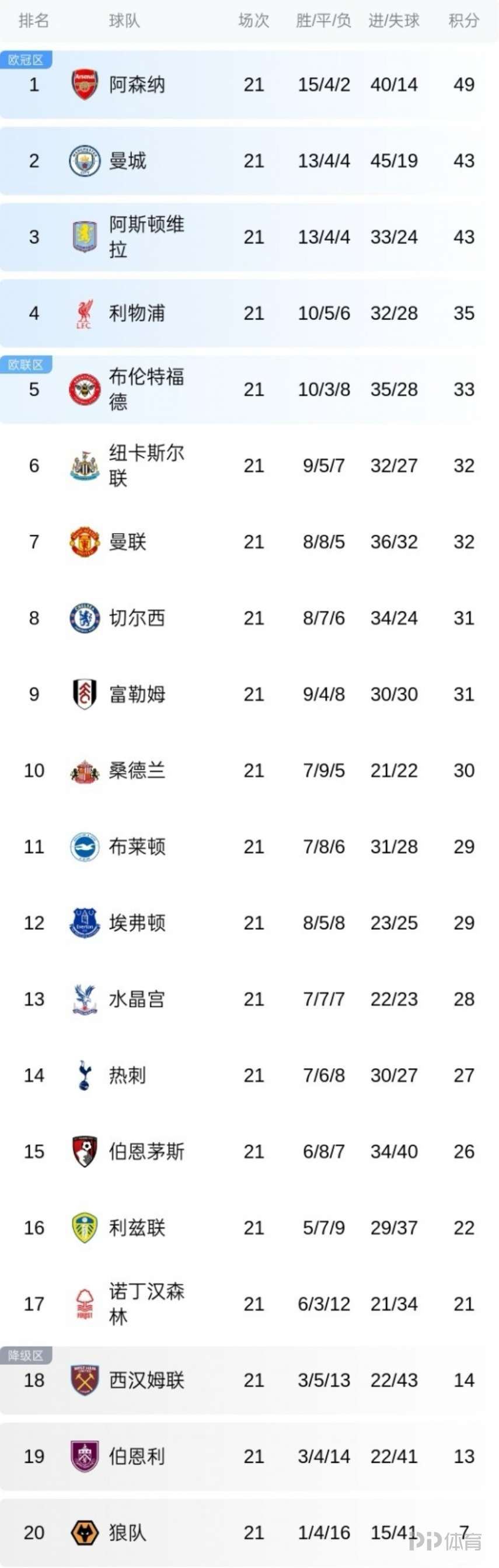 今晨阿森纳0-0利物浦,至此英超第21轮全部战罢,本轮前四名的四支球队均获平局。