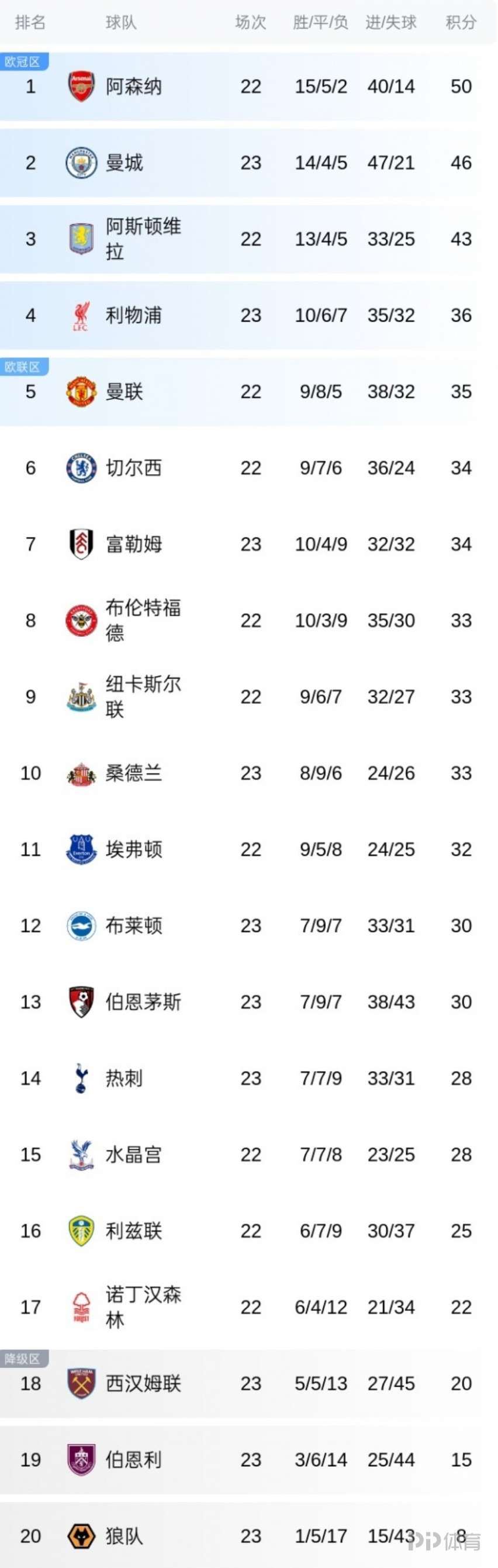 英超积分榜:阿森纳暂4分领跑 利物浦先赛输球仍居第四