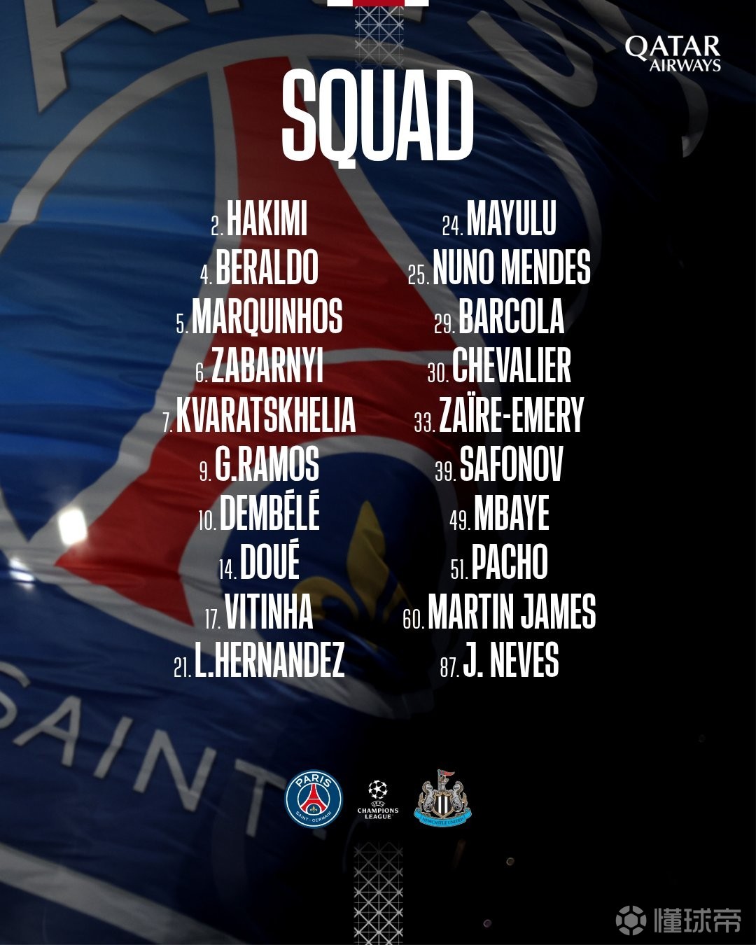 北京时间1月28日,巴黎官方公布了欧冠对阵纽卡斯尔联的大名单,其中登贝莱领衔,阿什拉夫、内维斯在列。