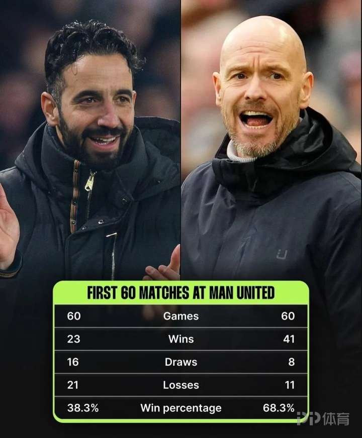 据统计,阿莫林执教曼联前60场胜率仅38.3%,而前任主帅滕哈赫的胜率高达68.3%。