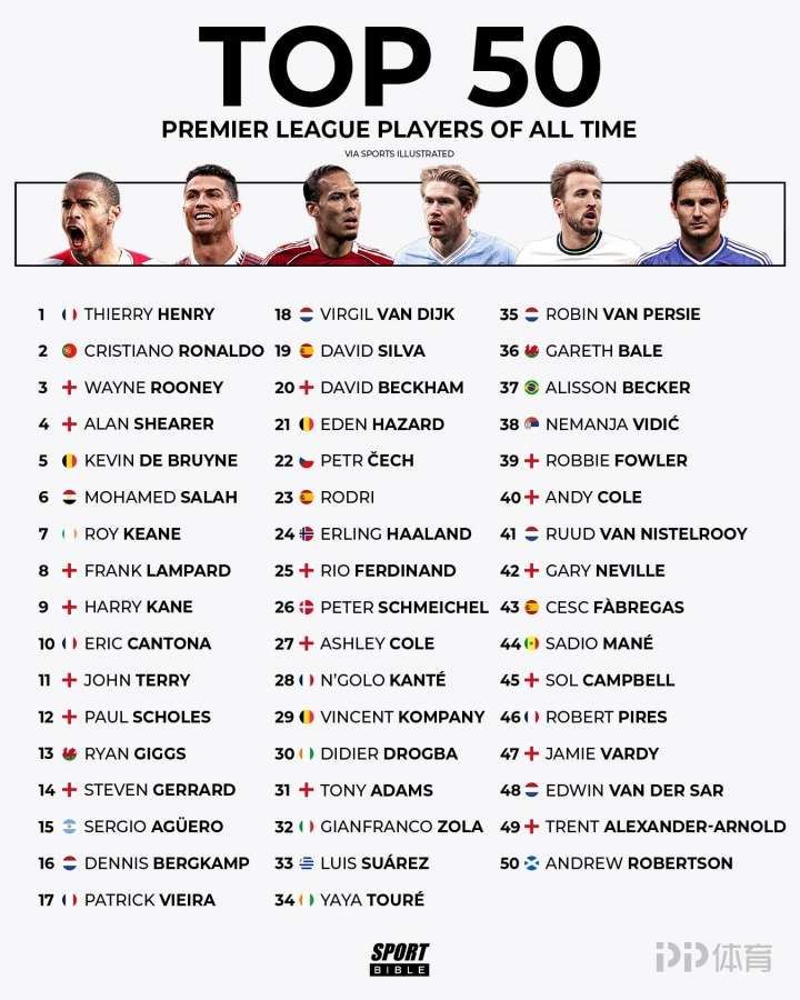 近日,知名体育媒体《体育画报》公布了英超历史50大球星,其中亨利第一,C罗第2,萨拉赫第6。