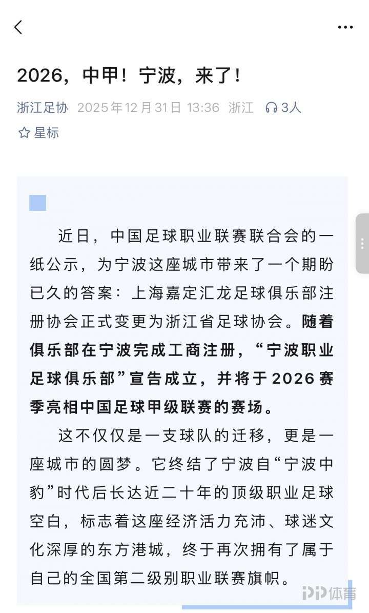 浙江足协官方宣布,随着俱乐部在宁波完成工商注册,“宁波职业足球俱乐部”宣告成立,并将于2026赛季亮相中国足球甲级联赛的赛场。