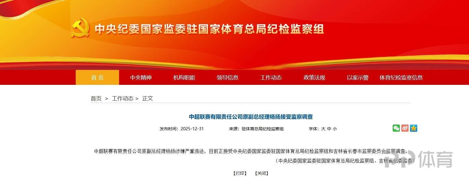 据国家体育总局消息,中超联赛有限责任公司原副总经理杨扬涉嫌严重违法,目前正接受中央纪委国家监委驻国家体育总局纪检监察组和吉林省长春市监察委员会监察调查。