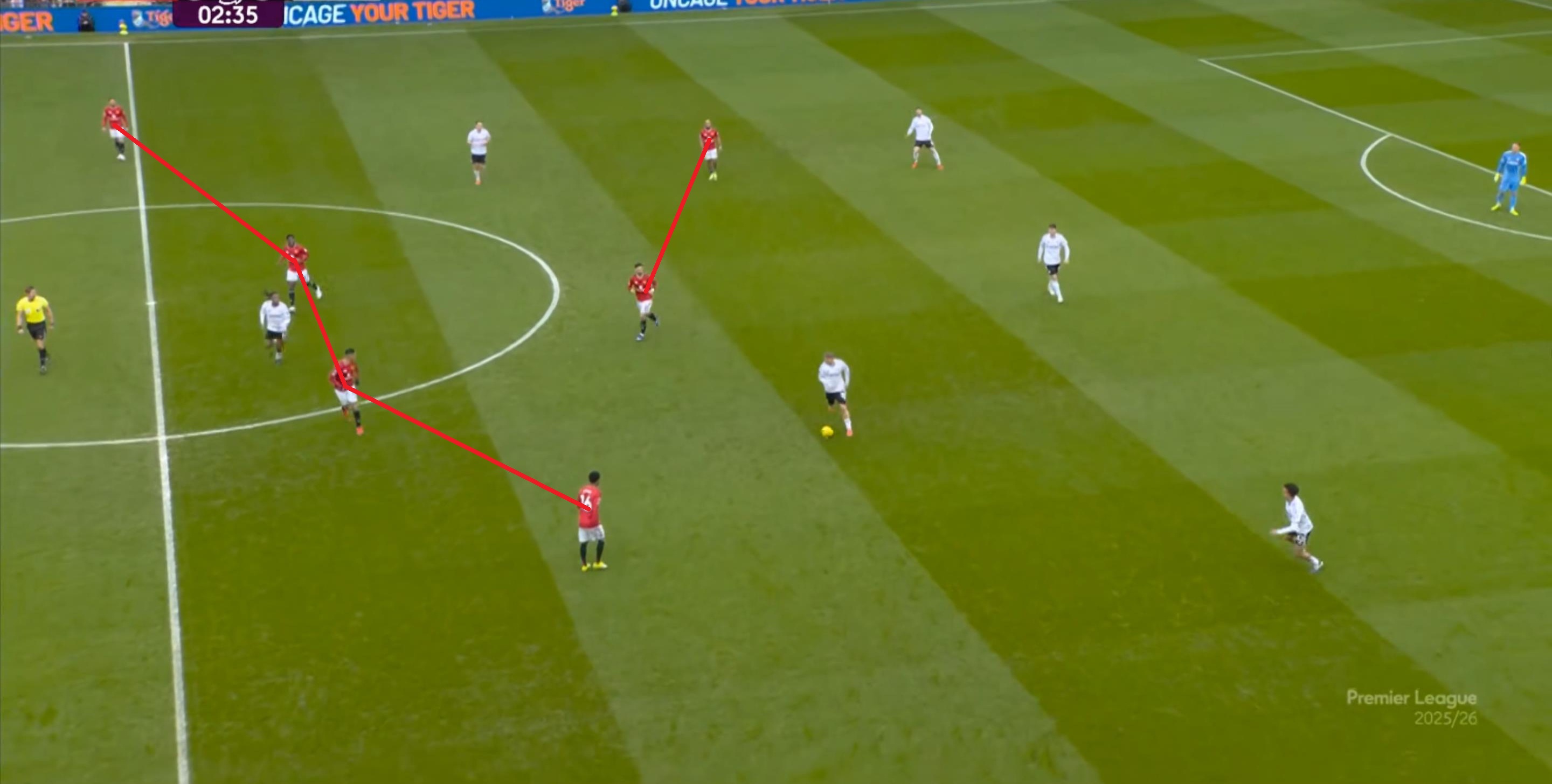 比如在出球阶段,富勒姆会直接寻找希门尼斯这个典型的中锋球员,从而破开曼联的逼抢,再从边路完成推进: