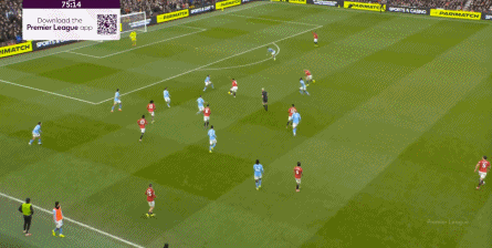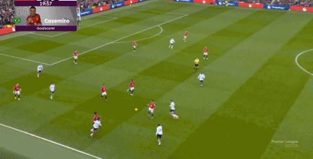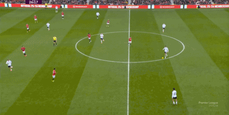 然后在不断的连续进攻当中,卡塞米罗找到了库尼亚,让曼联打进了第二球,但在库尼亚的进球之外,不要忘记曼联之所以能来到前场,是源自梅努在后场的带球和斜传: