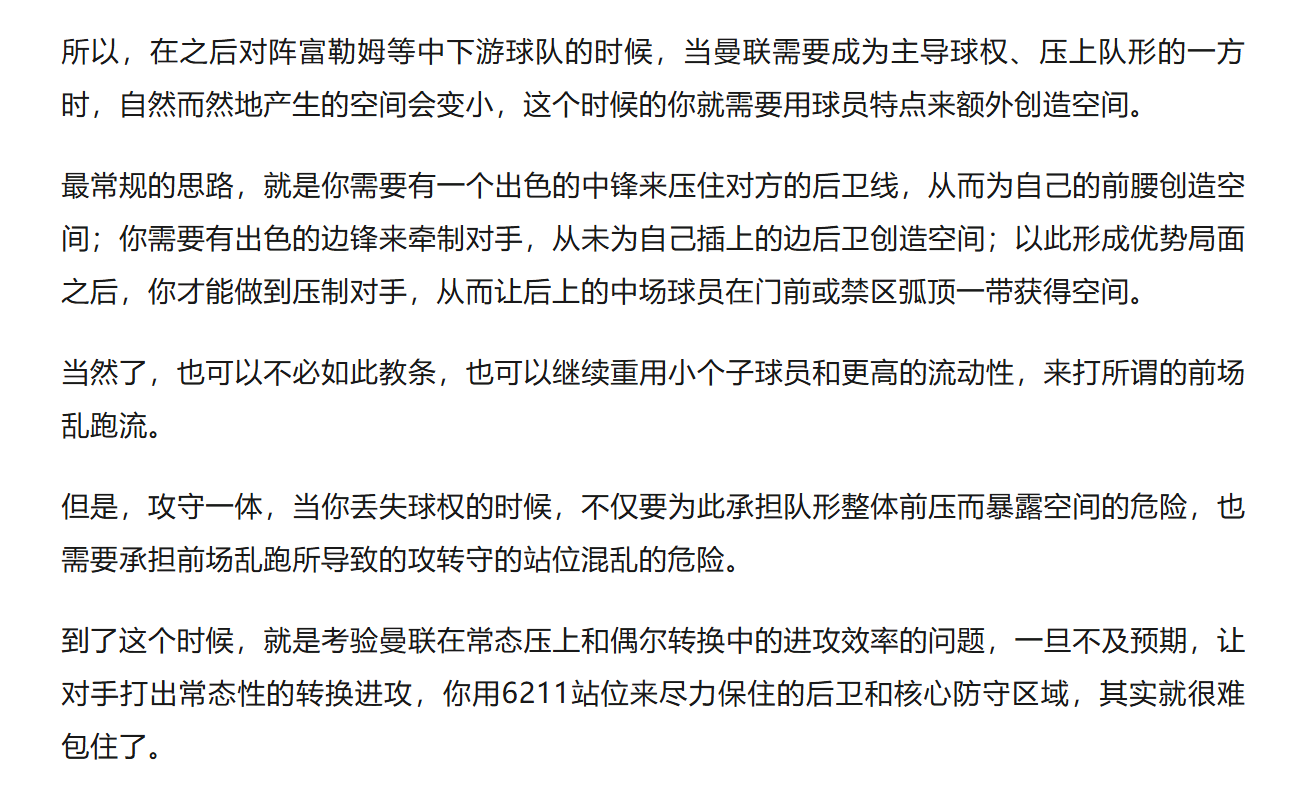 实际上,我对这一思路能否长期坚持仍有疑问,因为曼联的人员现实摆在这里,跑动量不能恣意拔高,否则容易出现身体层面的反噬,但不能忽略本赛季的一个客观现实,那就是曼联在下半程依然单线作战,所以索肖当年遭遇的伤病潮,可能不会出现在本赛季。