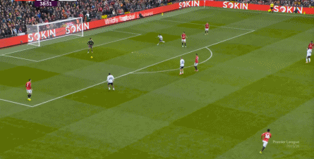 因为在凯文接球的时候,阿玛德-迪亚洛其实是跟着边后卫塞塞尼翁来到肋部的,这个时候的马奎尔的位置也是对的: