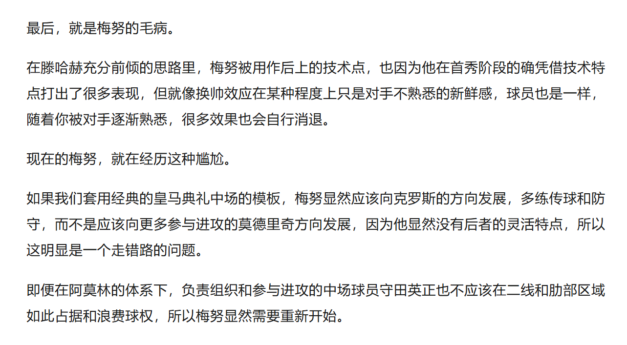 从这个角度来说,你要求梅努变成田径能力出色,防守风格强悍的后腰,其实也是不切实际的,他永远不可能变成莫德里奇,也不可能成为卡塞米罗,连乌加特都成不了,就应该朝着克罗斯的方向发展。