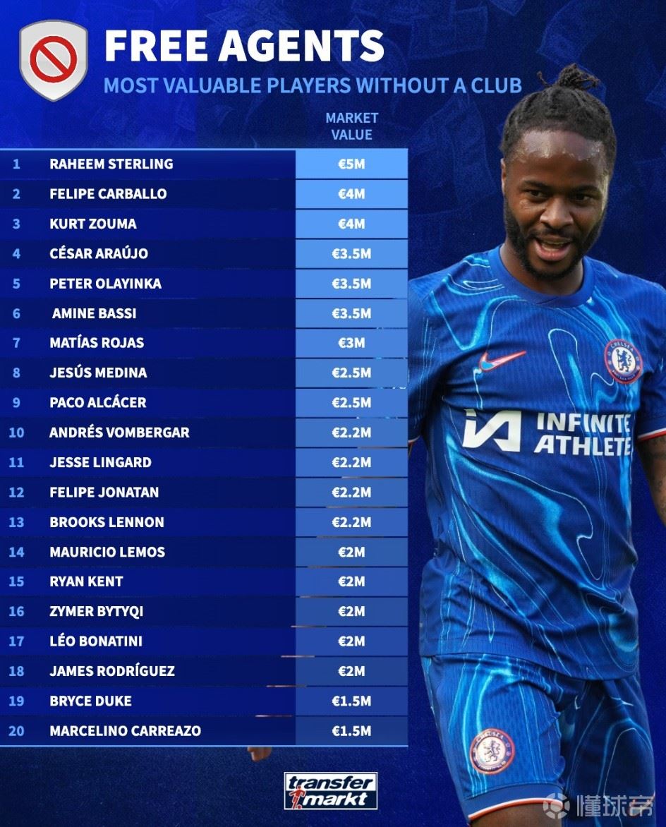 北京时间2月6日,德转统计出了目前身价最高的15名自由球员,斯特林以500万欧元排名第一,祖马、帕科、林加德以及哈梅斯-罗德里格斯上榜。