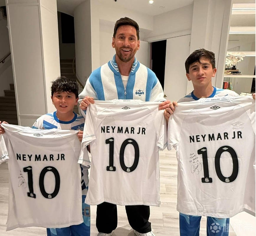 桑托斯官方晒出了内马尔给梅西和他的儿子蒂亚戈、马特奥赠送球衣的照片,可以看到,他们都获得了桑托斯10号,也就是内马尔的球衣,上面有内马尔的签名。