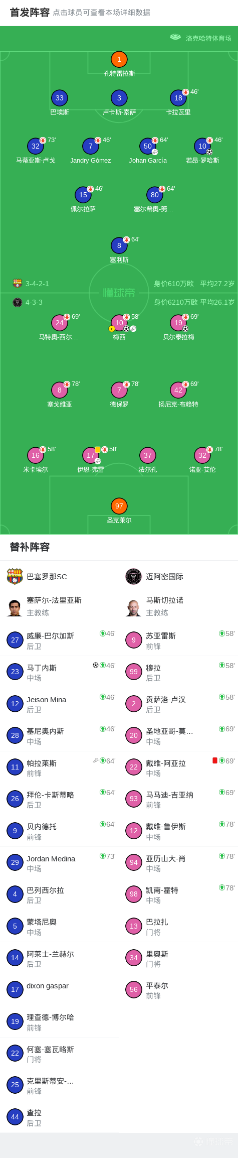 北京时间2月8日俱乐部友谊赛,巴塞罗那SC对阵迈阿密国际。上半场,梅西一条龙破门,之后对手由罗哈斯扳平,补时阶段梅西助攻贝尔泰拉梅再次领先。下半场,比赛尾声阶段阿亚拉染红,之后马丁内斯扳平比分。。最终比分巴塞罗那SC2-2迈阿密国际。