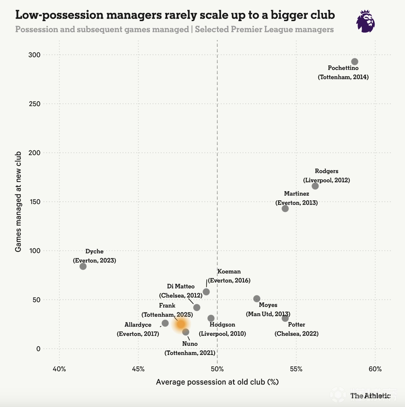 这一点可以通过数据略微量化。这里有一张稍显不同寻常的图表。它统计了那些从其他英超俱乐部跨入“大俱乐部”的主教练(大俱乐部定义为在英超征战超过15个赛季的俱乐部——阿森纳、切尔西、埃弗顿、利物浦、曼城、曼联和热刺)。横轴是他们在原俱乐部的平均控球率,这大致反映了战术风格;纵轴是他们在新俱乐部执教的场次,粗略衡量成功程度。