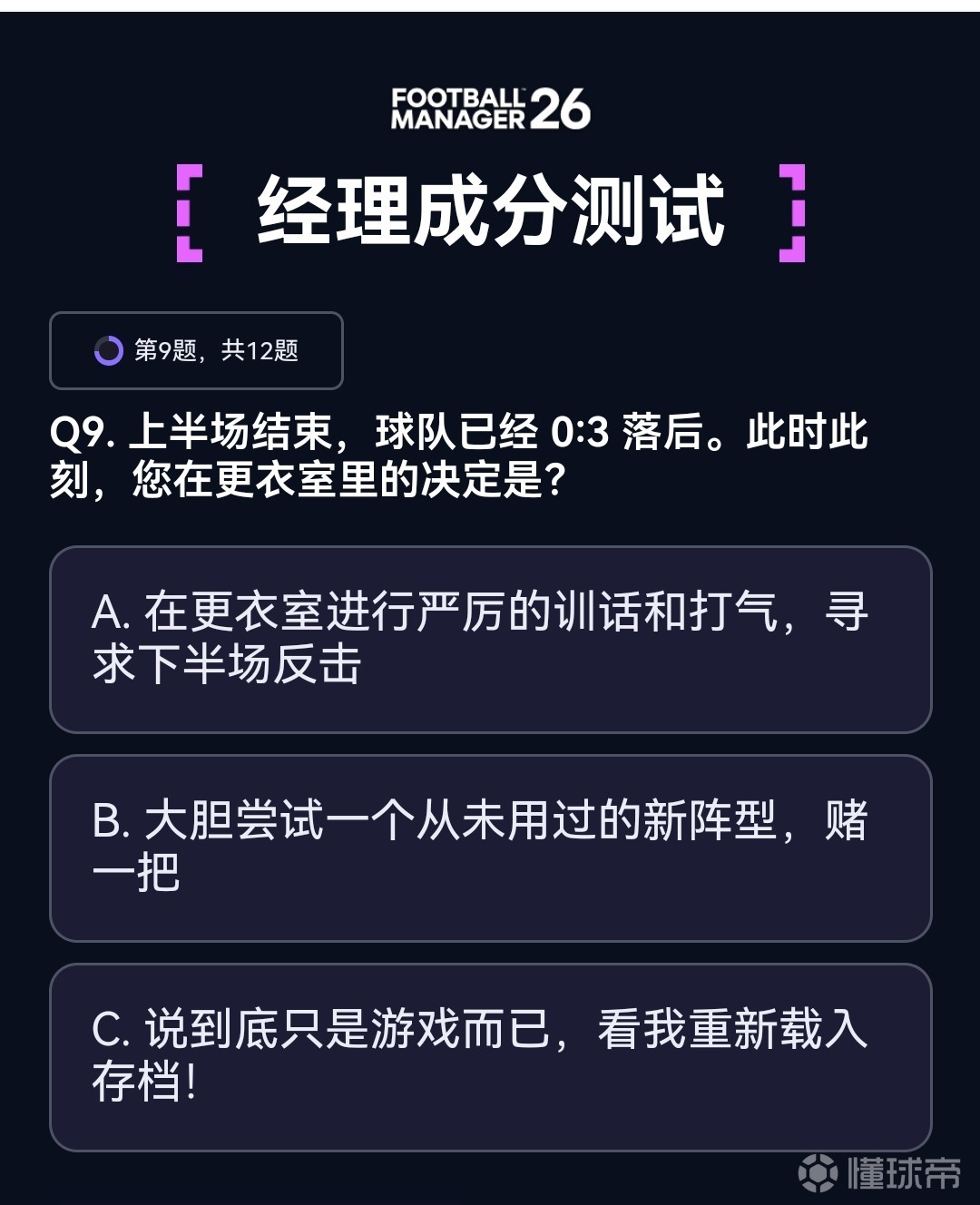 该测验基于游戏庞大的真实数据库与足球管理逻辑,通过12道源自《足球经理》经典场景的选择题,模拟您在球队选择、用人思路、管理方式以及应对压力时的判断逻辑。这些情境将考验你的战术素养,映射出你在人员管理、心理激励、危机应对等多维度的真实倾向。