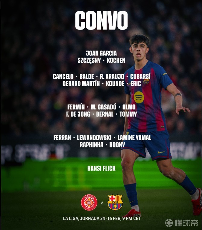 北京时间2月16日,巴塞罗那官方公布了明天凌晨4点客战赫罗纳的大名单,莱万、亚马尔领衔,拉菲尼亚回归。