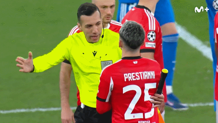 欧冠1/8决赛附加赛首回合,皇家马德里客战本菲卡,维尼修斯进球后因庆祝吃到黄牌,随后被普雷斯蒂亚尼种族歧视言语攻击,维尼修斯向裁判投诉后,裁判启动反种族歧视协议,比赛暂停维尼修斯回到替补席。几分钟后,维尼修斯回到场上,比赛恢复。