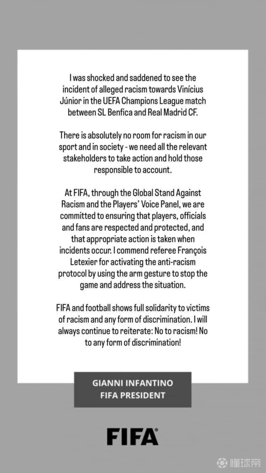 国际足联主席就欧冠联赛皇马客场对阵本菲卡一役中普雷斯蒂安尼事件发声,谴责针对维尼修斯的种族主义行为,并针对这起涉嫌种族歧视的指控表明强硬立场。