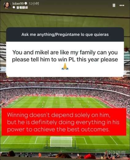 阿森纳主帅阿尔特塔的妻子洛蕾娜最近在社媒与网友互动,谈到了她的丈夫率队争夺英超冠军的话题。