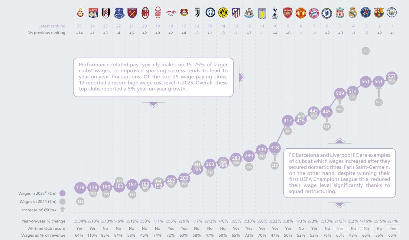 2025年球队薪资支出:曼城5.57亿欧第一,巴萨第二皇马第四