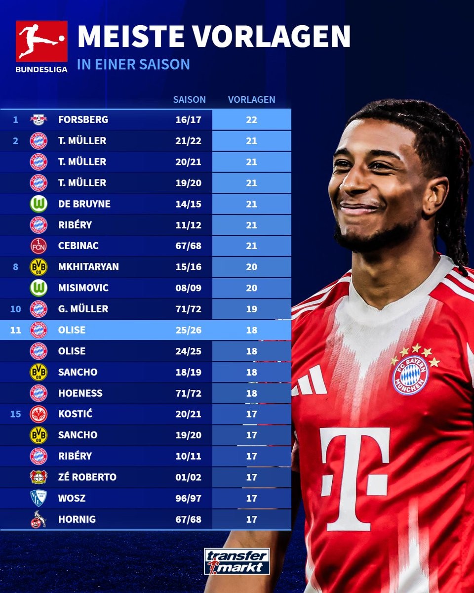 奥利塞本赛季德甲已送出18次助攻,距离德甲单赛季纪录还差4次