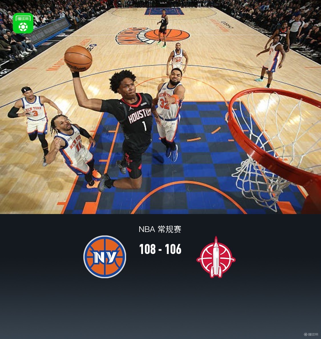 尼克斯108-106逆转险胜火箭,唐斯25+7,杜兰特空砍30分