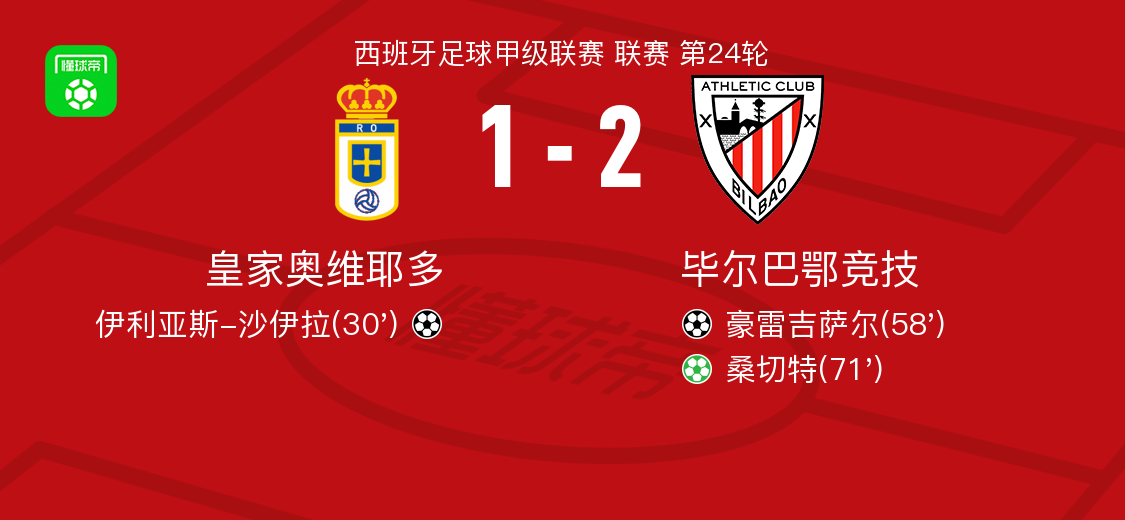 毕尔巴鄂竞技2-1逆转皇家奥维耶多,桑切特点射,豪雷吉萨尔破门