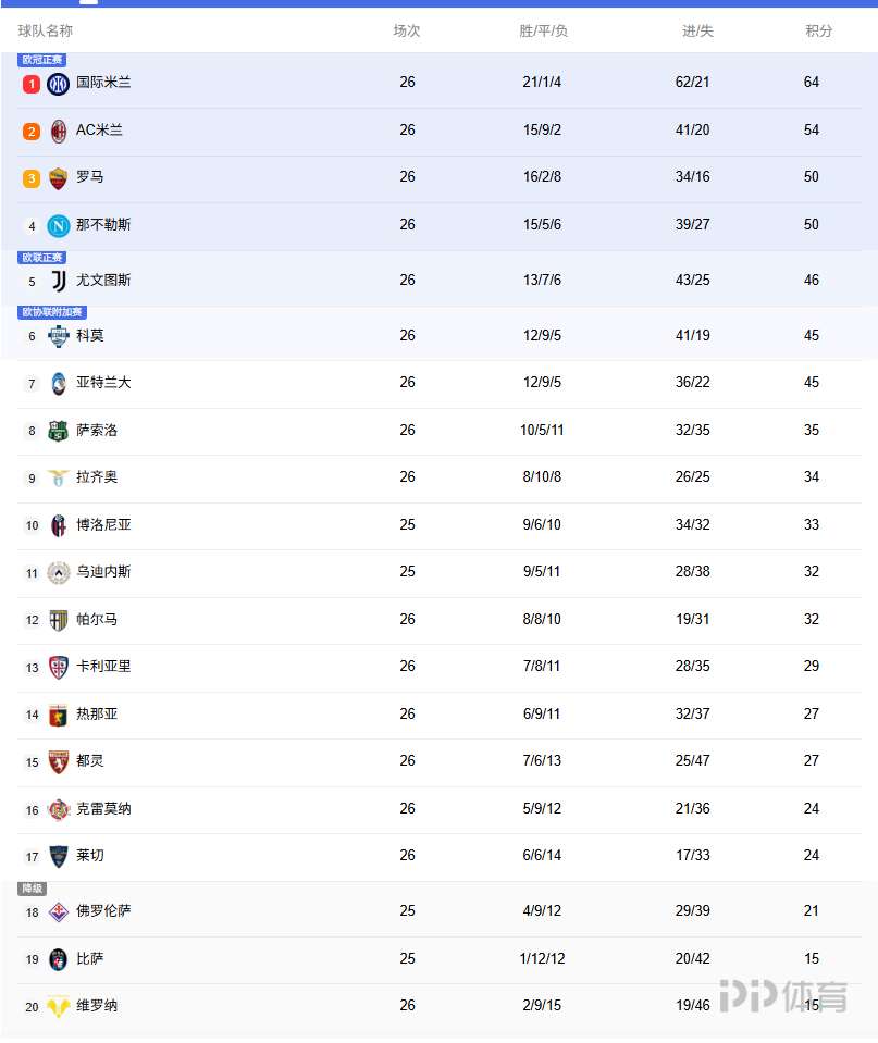 意甲积分榜:罗马升至第三与那不勒斯同分,米兰遭遇近25轮首败