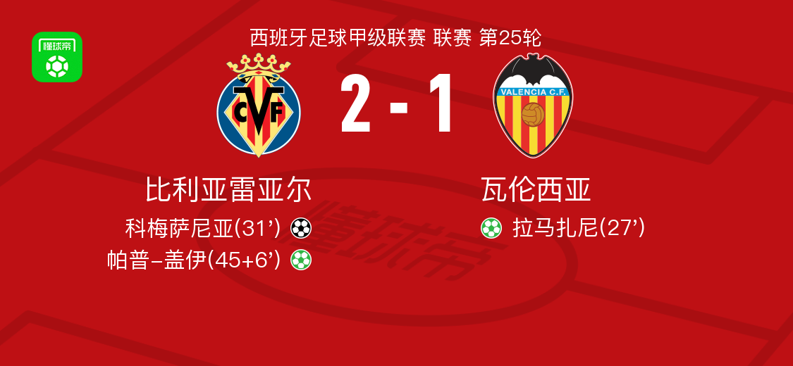 比利亚雷亚尔2-1逆转瓦伦西亚,帕普-盖伊点射,科梅萨尼亚破门